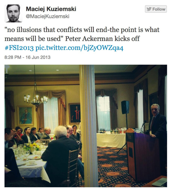 Maciej Kuziemski picked out one of the most important takeaways from Dr. Peter Ackerman’s welcoming remarks. This is a message that will be a continuing thread throughout the week. After all, the word “conflict” exists in the title of the organization that is hosting this event because of a firm belief that conflict cannot, should not, and will not be eliminated, but it can be approached and waged through nonviolent, civilian-based, non-military means.