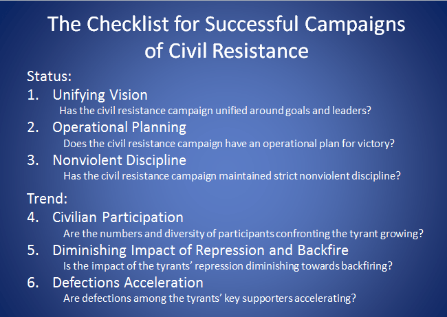 It’s a six-item-long checklist for successful campaigns of civil resistance, and it aims to get struggling movements back on track.