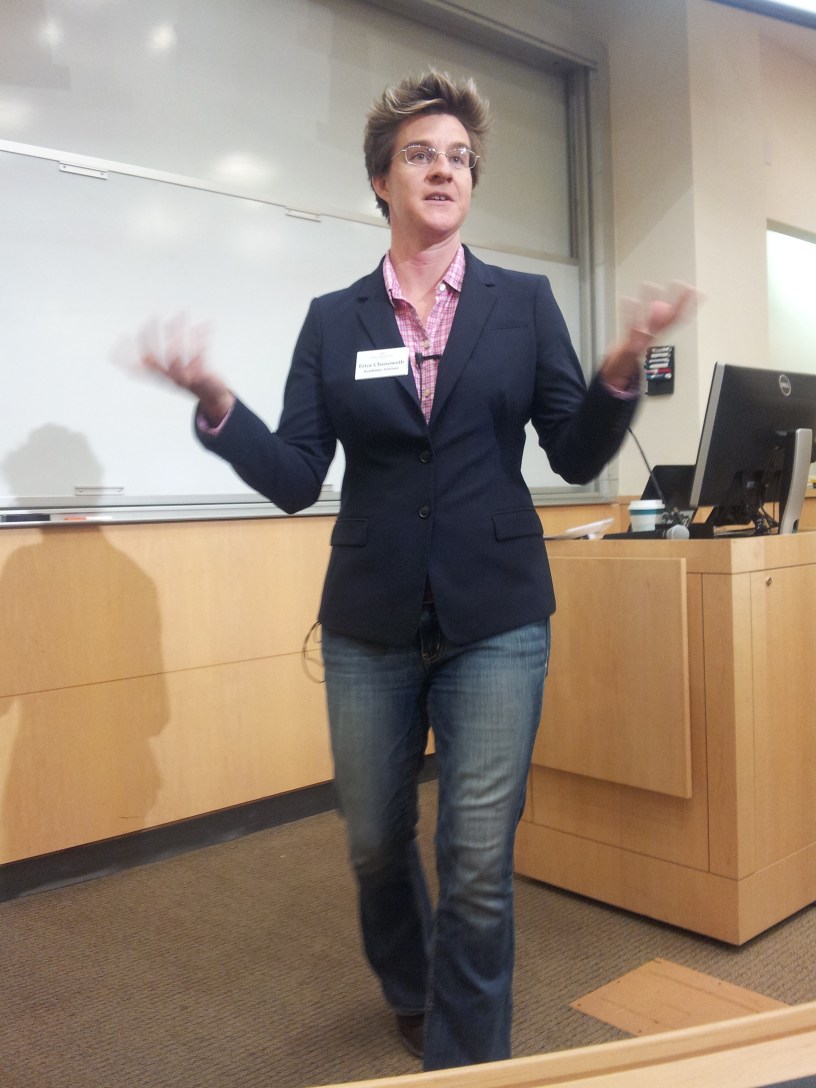 Erica Chenoweth, a researcher and renowned specialist on nonviolent conflict and civil resistance and co-author with Maria Stephan on Why Civil Resistance Works: The Strategic Logic of Nonviolent Conflict (link below), engaged the participants with discussions on how those in power repress and how those in civil society can counter that repression. She argued that to be involved in a successful nonviolent movement, you don’t need to be a martyr and that “retreating and regrouping” is sometimes a wise strategy. “We can lose a battle, but win the war”. She also discussed the work of Brian Martin who studies how to manage repression to the best effect for a movement, so-called “backfire” (link to Martin’s book, Justice Ignited: The Dynamics of Backfire below).
